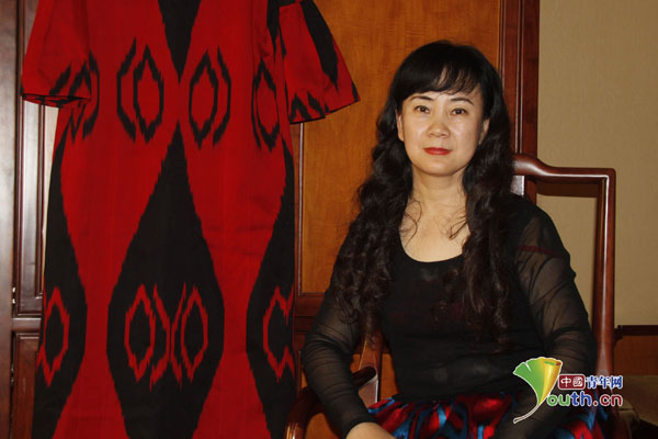 程应奋和她设计的艾德莱斯时装。 中国青年网记者 纪万林摄