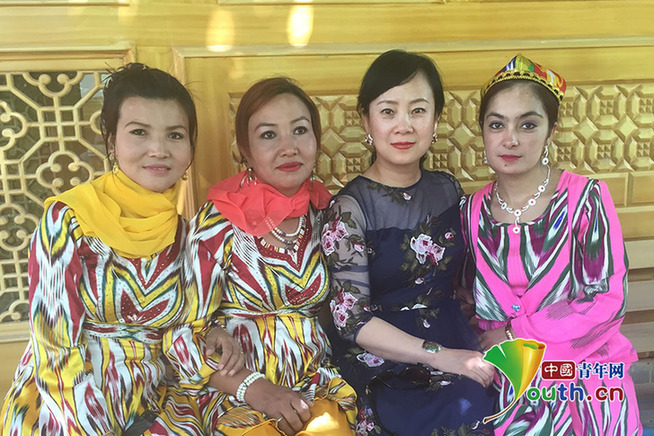 程应奋和穿着艾德莱斯服装的维吾尔族姑娘们在一起。艾德莱斯服装历史悠久,是维吾尔族妇女出席宴会等正式场合的必备服装。 本人供图