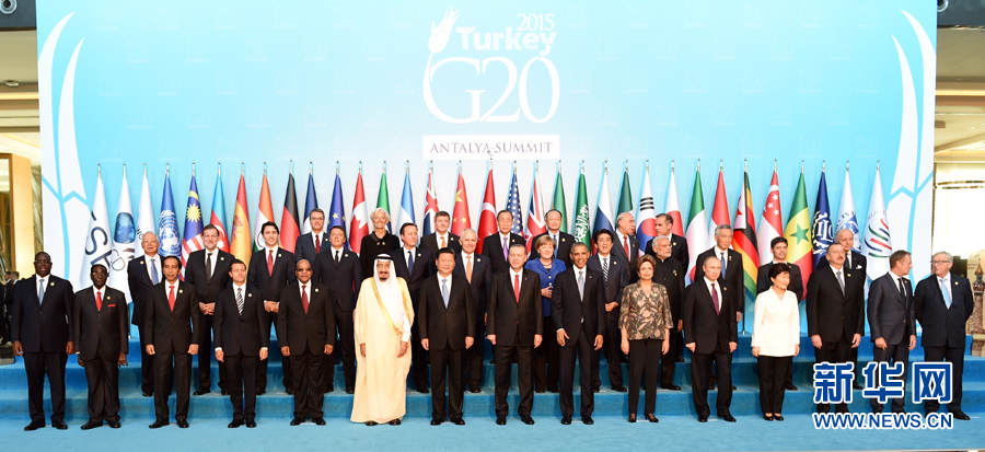 11月15日,二十国集团领导人第十次峰会在土耳其安塔利亚举行。国家主席习近平出席并发表题为《创新增长路径共享发展成果》的重要讲话。这是习近平主席同与会领导人合影。 新华社记者 李学仁 摄