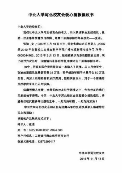 据了解,这封倡议书是由中北大学河北校友会发起的,全名是《中北大学河北校友会爱心捐款倡议书》。在这封倡议书中,他们以集体的名义向母校校友发起倡议,想靠大家的力量救助一位身患急性髓性白血病的年轻校友,张迪。