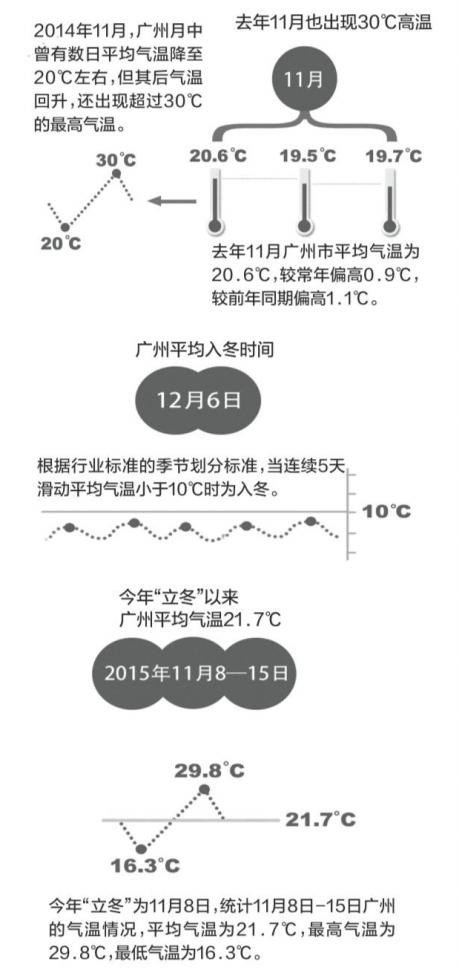今年“立冬”为11月8日。统计11月8日-15日广州气温情况显示,平均气温为21.7℃,最高气温为29.8℃,最低气温为16.3℃。根据行业标准的季节划分标准,当连续5天滑动平均气温小于10℃时为入冬,广州并未出现入冬情况。