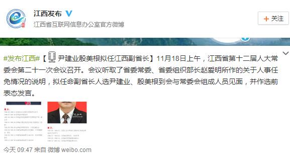 据江西省互联网信息办公室官方微博消息,11月18日上午,江西省第十二届人大常委会第二十一次会议召开。会议听取了省委常委、省委组织部长赵爱明所作的关于人事任免情况的说明,拟任命副省长人选尹建业、殷美根到会与常委会组成人员见面,并作选前表态发言。