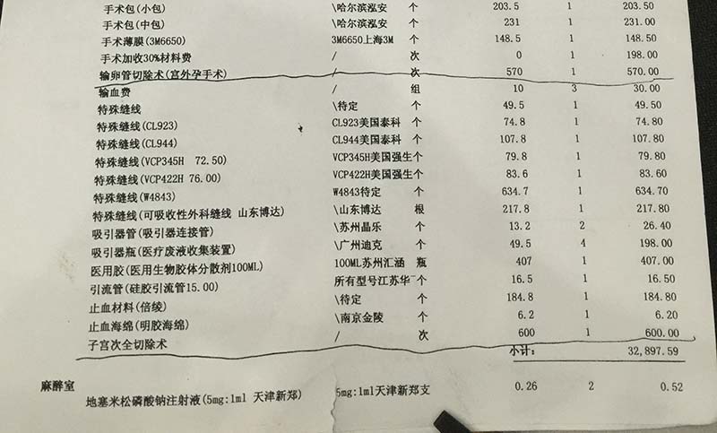 10月19日周一上午,小云终于拿到了医院打印的费用清单。从10月11日00:49分到10月19日9:02分,各项手术、药品费用总计为46286.54元。再仔细一看,小云惊呆了,尽管没学过医学,但小云也意识到清单上“腹式全子宫切除术”、“卵巢囊肿剔除术(单侧)”、“输卵管切除术(宫外孕手术)”、“子宫次全切除术”这4项手术项目不应该属于父亲,而这几项的费用加起来是2385元。