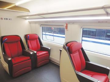 在客舱座椅方面,CRH380D型动车为了提高乘客舒适度,每个座椅均配备有小桌、书报网、扶手等设施,为了防止乘客眩晕,座椅采用旋转式设计,使乘客乘坐方向与运行方向保持一致。同时,每个座椅的靠背均可调节倾斜角度。