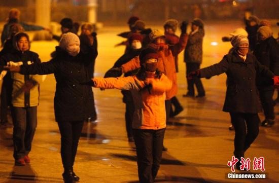 东北大妈雾霾天全副武装跳广场舞。图片来源:视觉中国