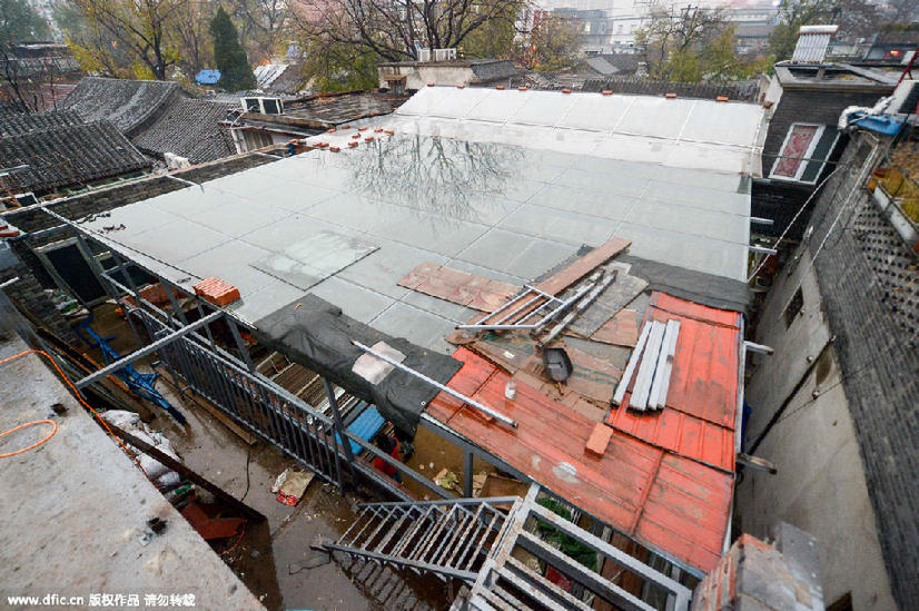 涉案违建地下室就位于纱络胡同内相邻的两幢平房之下。两房分别带有一个院子,从表面上与周围其他平房并无不同,只是西侧那幢平房的院门口多挂了一个卷帘门。然而,在进入西幢平房的院内后,可谓别有洞天。院内堆放着大量的钢筋、沙子、红砖和其他建筑材料,还有一些安全帽和建筑工具等。
