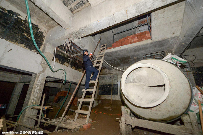 从地下一层通往地下二层,是一个木质结构的简易楼梯,踩在上面晃晃悠悠。地下二层的面积是一层的2至3倍左右,部分墙面已用混凝土封起来,尚未封起的墙面上能看到多根钢筋混凝土的支柱。二层内,放置有7个手推车及一个混凝土搅拌机,另有一根粗大管道从地面直接垂下。据闫建恒介绍,该管道直通地面,用于运送水泥、沙土等建筑材料。