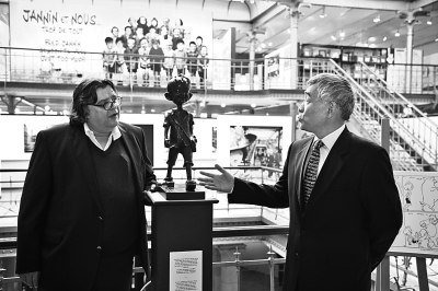 18日,中国驻比利时大使曲星向比利时漫画博物馆赠送了中国漫画家张乐平创作的漫画人物三毛的铜塑像。这座高60厘米的塑像由中国雕塑家杨宝增塑造完成。据悉,三毛塑像将作为比利时漫画博物馆的藏品长期在中心展出。曲星大使还向中心图书馆赠送了中国名著《三国演义》《水浒传》《西游记》的“小人书”版。图为曲星大使(右)和比利时漫画博物馆馆长奥吉耶(左)在赠送仪式上。本报驻布鲁塞尔记者 刘军摄