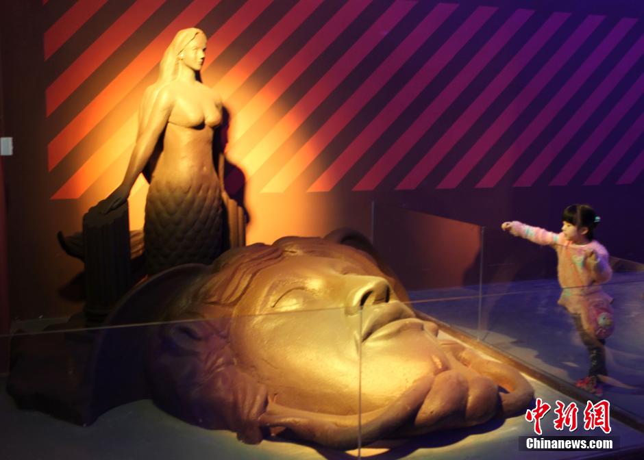巨型巧克力雕塑吸引小朋友眼球。 周毅 摄