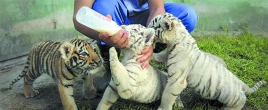 保育员在给园里的小白虎喂奶。