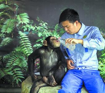 为了引导猩猩喝水,保育员往往要你一口、我一口,轮流喝水,情同“父子”。