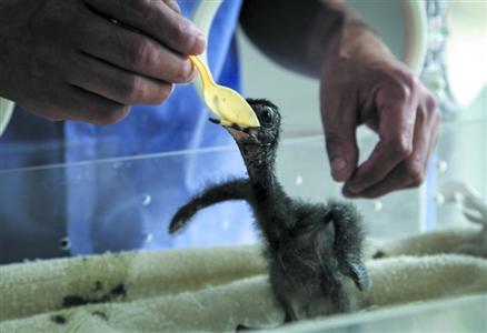 对美洲红鹮幼鸟的喂食要非常精细。