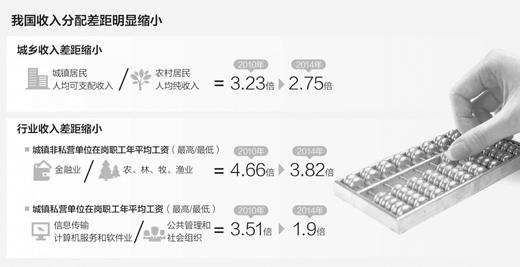 “十二五”期间,我国城乡居民人均可支配收入明显增长,收入分配差距也在缩小。人力资源和社会保障部劳动工资研究所研究二室主任、副研究员刘军胜介绍,2014年,代表全国居民收入水平差距的基尼系数为0.469,是2003年以来的最低值。从2010年到2014年,城乡居民收入差距从3.23倍缩小到2.75倍,行业收入差距也有缩减。与此同时,收入分配格局也得到明显改善。2014年与2010年相比,居民收入在国民收入分配中的比重上升。