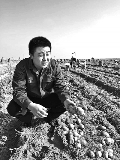 位于陕西榆林沙漠中的土豆迎来了大丰收。80后创业者苏国飞于2014年初和同学成立了荣泽农业公司,将位于毛乌素沙漠腹地的沙漠进行治理,改造成可以种植的土地,用来发展高科技现代农业。其中,土豆种植面积达3000亩,丰收的土豆已经进入北京市场,公司发展带动了当地村民致富。本报记者 赵洪波摄