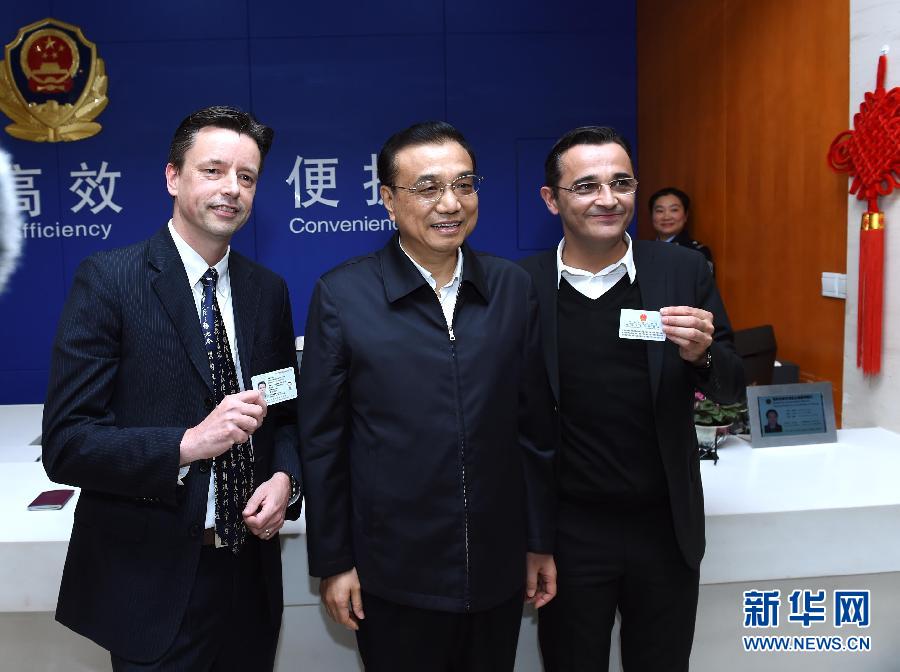 11月25日,中共中央政治局常委、国务院总理李克强在结束中国-中东欧国家领导人会晤后,到上海考察自贸试验区改革开放的最新进展。这是李克强在境外人员永久居留证办理窗口同两位领取“中国绿卡”的外籍人士合影。新华社记者 饶爱民 摄