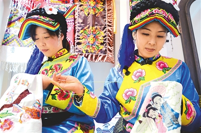 陕西宁强县羌绣历经千年传承和发展,已成为宁强名片之一。图为“绣娘”们为第五届成都国际非遗节上签订的订货赶制羌绣。