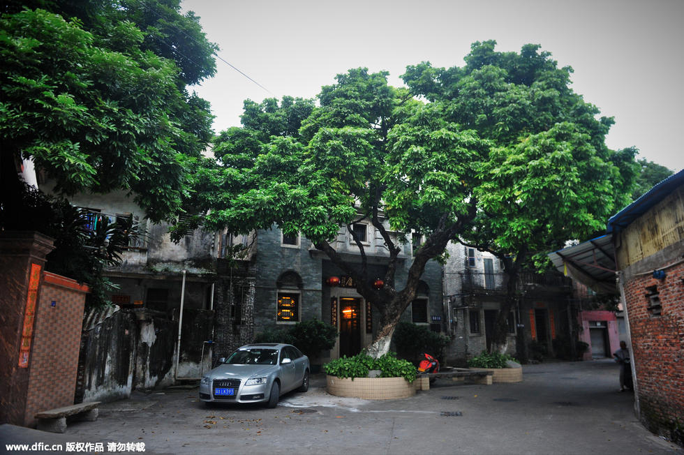 村子绿树环绕,环境清幽,私家车、轿车停放在路边。