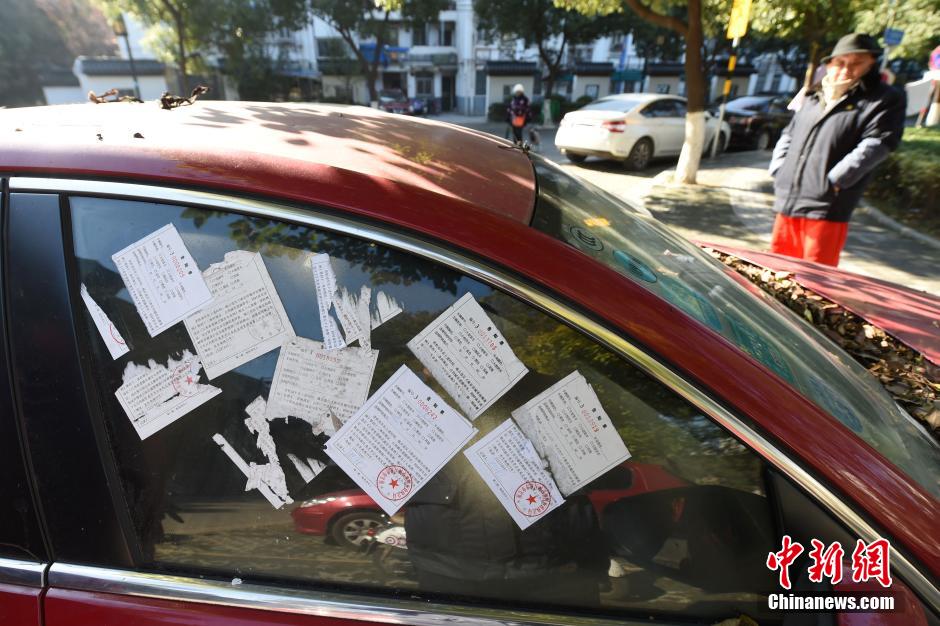 11月27日,南京明城墙东水关内,一辆私家车的两侧玻璃上贴了近20张不同时间的违停单,由于车主没有及时清理干净,新旧交替惹人注目。中新社记者 泱波 摄