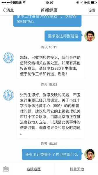 据张先生介绍,11月26日,他通过微博发文质疑北京市999急救中心,称自己在转院过程中遭到急救车工作人员欺骗,以协和等三甲医院挂不上号为由,将其送往北京市红十字会紧急救援中心,“涉嫌利益输送”,并称已向北京市卫计委投诉。此后,北京市卫计委通过其官微回复张先生999急救中心不归其管,建议向999急救中心的上级主管部门红十字会反映此事。
