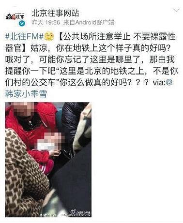 @北京往事网站转发网友照片并称妈妈地铁哺乳不雅。网络截图