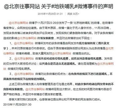 新京报讯 近日,某公益组织微博在转发一位在北京地铁哺乳的妈妈照片时批其为“裸露性器官”,此言论发出之后引发热议。昨日,涉事微博对此进行道歉,并宣布注销@北京往事网站ID,暂停使用。