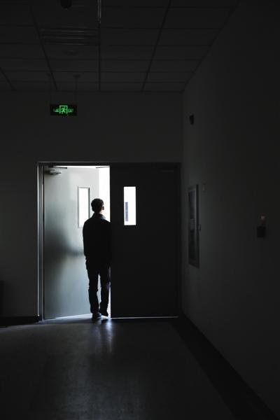 昨日,北京某高校教学楼的楼道里,艾滋病感染者李维推开通往室外的门。