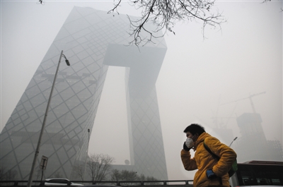 11月30日,戴着口罩的行人走过雾霾中的央视新楼。新京报记者 彭子洋 摄