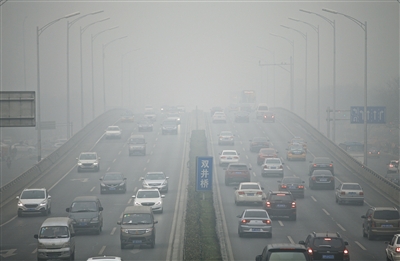 11月30日,雾霾中,双井桥上能见度明显不高。新京报记者 周岗峰 摄