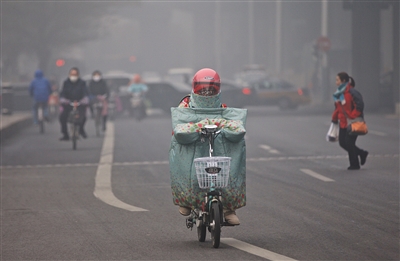 11月30日,国贸附近,为对抗雾霾,骑电动车的行人几乎是“全副武装”。新京报记者 周岗峰 摄