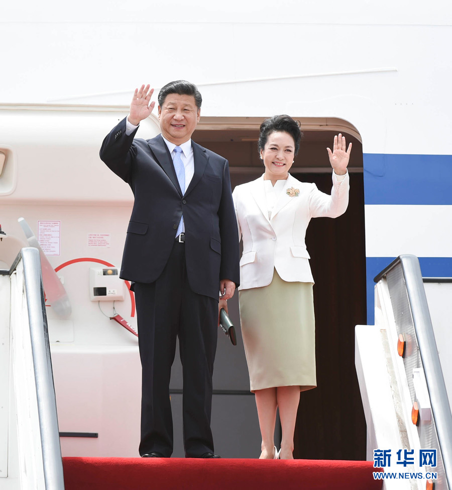 12月1日,中国国家主席习近平乘专机抵达津巴布韦首都哈拉雷,开始对津巴布韦进行国事访问。津巴布韦总统穆加贝在机场举行隆重欢迎仪式。这是习近平和夫人彭丽媛向欢迎人群挥手致意。新华社记者 谢环驰 摄
