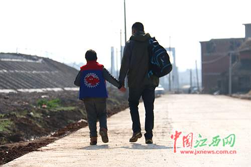 杨彬牵着放学的儿子回家