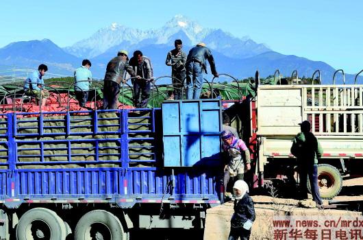 ▲11月24日,云南省玉龙纳西族自治县太安乡天红村的农民在装运外销的土豆。从2011年开始,当地政府对天红村进行“精准扶贫”,帮助该村调整产业结构,结对帮扶贫困户,带动村民发展马铃薯、秋油菜、玛咖、中药材等高原特色产业和观光旅游业,农民收入大幅增长。 新华社记者杨宗友摄