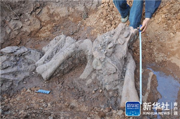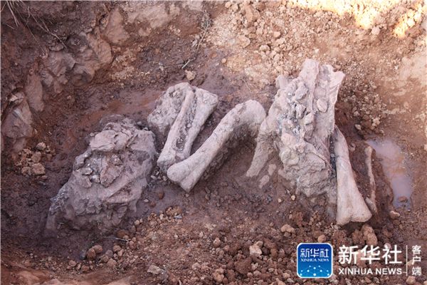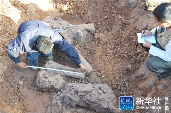 ↑据专家现场初步鉴定推测为距今约1.8亿年“巨型禄丰龙”的化石(12月7日摄)。新华社记者 姚兵 摄