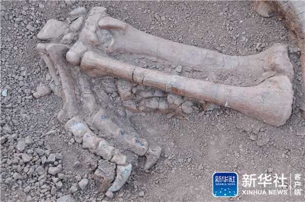 ↑一具恐龙化石的右爪被专家做上了记号(12月7日摄)。据专家现场初步鉴定推测,这是距今约1.8亿年的“巨型禄丰龙”化石。新华社记者 姚兵 摄