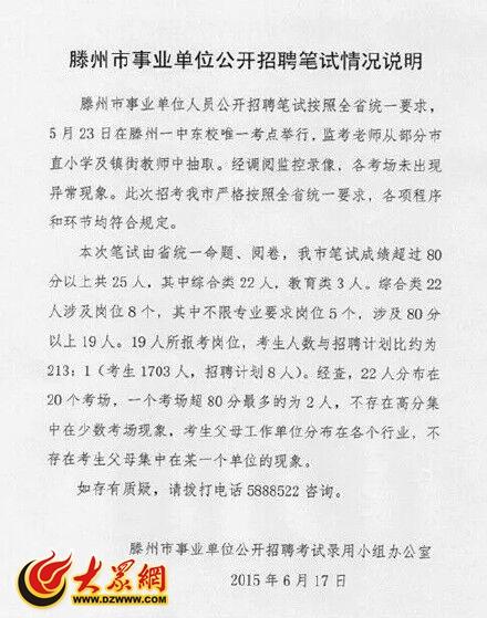 今年6月,2015年滕州市事业单位公开招聘笔试成绩公布,滕州共有25人笔试成绩超过80分,“异常高分”受到质疑。