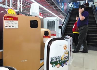 昨日,望京国际商业中心大中电器店,各品牌的空气净化器摆在显眼的位置。