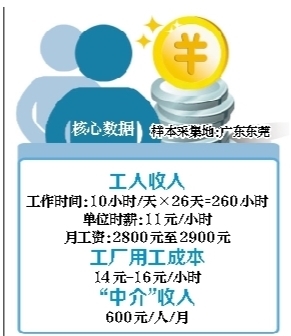工厂付出的14至16元/小时的用工成本实际是从劳务中介拿人的成本,劳务中介则按照13.5元/小时与“工头”结算,大约从中赚走1.5至2.5元/小时。“工头”则给工人开出11元/小时的价格,从中赚走2.5元/小时。