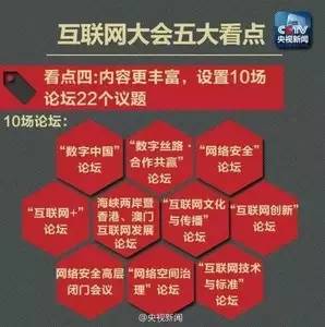 本届大会除了开、闭幕式,还设置了10场论坛、22个议题,涉及网络文化传播、互联网创新发展等前沿热点问题。同时,大会还新设了“互联网之光”博览会,用以展示我国和世界互联网发展的前沿技术和最新成果。