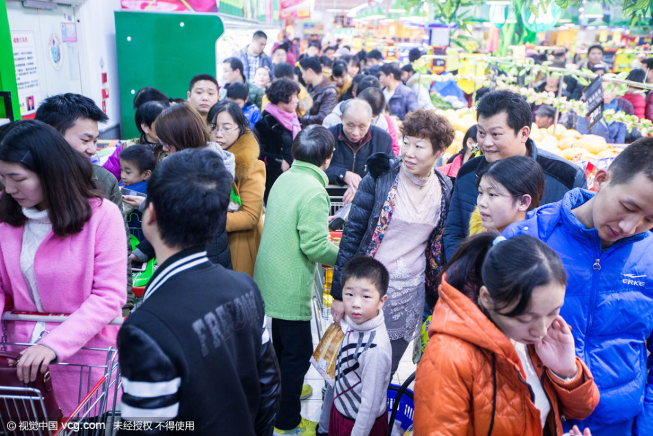 2015年12月13日,浙江省杭州市,一家超市连续三天五折优惠促销,促销最后一天晚上,超市内众多货架上的商品已经被抢光,只剩下空架子。纸巾、卫生巾、大米和洗衣粉等日用品最受欢迎。收银台前也排起了超长的队伍,需要排队一个小时左右才能够完成付款。