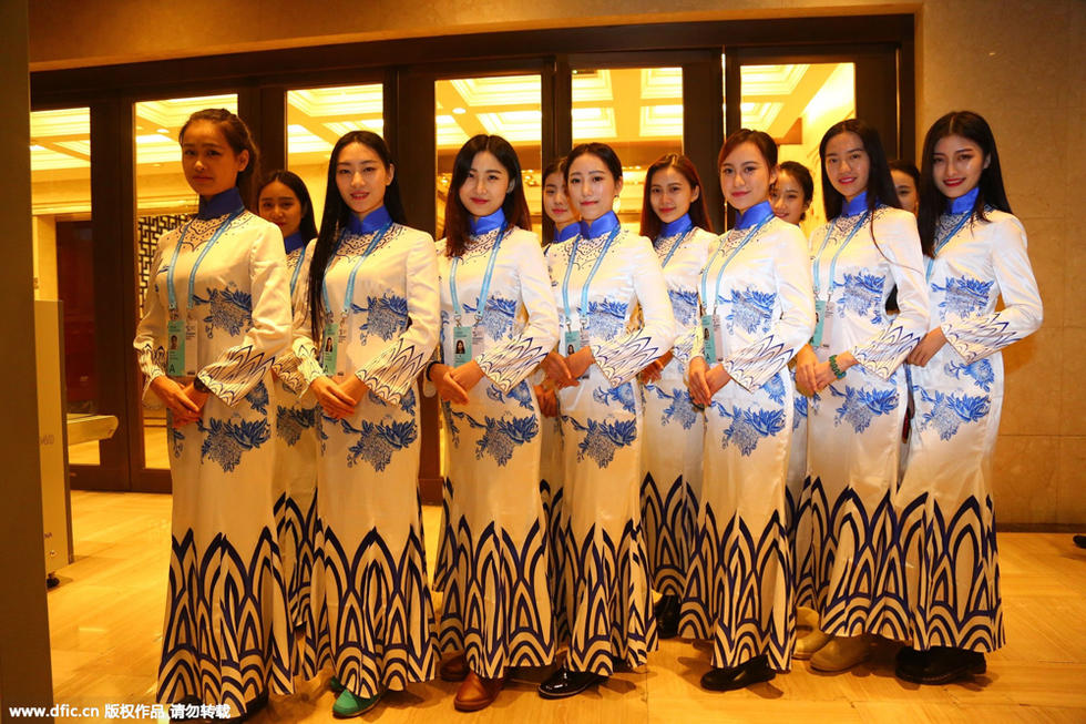 浙江传媒学院的大学生礼仪换上第二届世界互联网大会的青花瓷旗袍首次亮相。