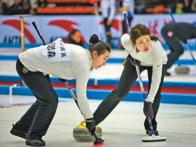 12月14日,哈尔滨代表队的选手在比赛中。当日,第五届中国·伊春世界六强国际女子冰壶邀请赛在黑龙江省伊春市进行。
