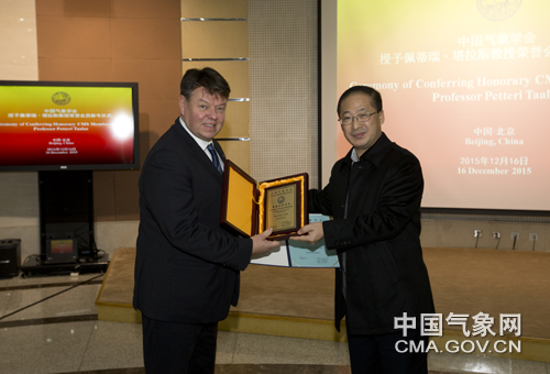 中国气象报记者吴鹏 庄白羽 通讯员陈永清报道12月16日,中芬气象科技合作联合工作组第十二次会议在北京召开。当天下午,中国气象学会授予世界气象组织(WMO)候任秘书长、芬兰气象局局长佩蒂瑞·塔拉斯教授“中国气象学会荣誉会员”称号。中国气象局局长郑国光,中国气象学会理事长王会军,中国气象局副局长沈晓农出席授予仪式。中国气象学会秘书长翟盘茂主持授予仪式。