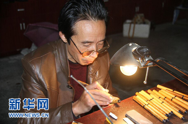 新华网杭州12月17日电(记者汪金福、王婵)年近六旬的翁其昌端坐在一盏发黄的台灯下,满是沧桑的脸上写着无奈,一支小巧的月牙刻刀在毛笔杆上熟练地游走,不一会工夫,唐代文学家张志和的词《渔歌子》变成纤细如毫蝇头小楷呈现在笔杆上。