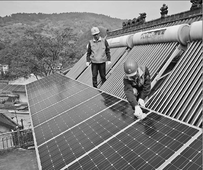 图为工作人员在为村民安装屋顶电站。