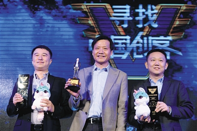 小米创始人雷军(中)为小赢理财创始人黄聪(左)和ANG无双科技创始人施侃(右)颁奖。