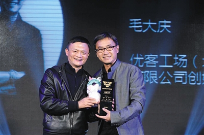 阿里巴巴董事局主席马云(左)给优客工场创始人毛大庆(右)颁奖。