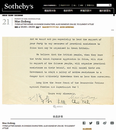 记者在苏富比官网上查询到这封重要信函的拍品详情和拍卖结果。根据苏富比官网介绍称,这封英文信函是打字机打出来的,上面有毛泽东和朱德的亲笔中英文签名,其中英文签名采用的是韦氏拼音的拼法。1937年11月1日,这封信被从陕西延安寄出。毛泽东在信中表明对英国人民的团结与友好的态度,并呼吁对方采取实际行动,帮助中国抵抗日本的侵略。