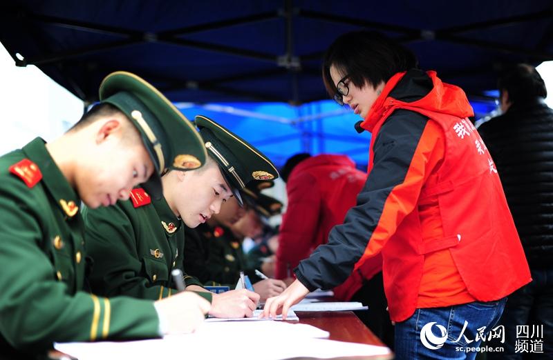 武警官兵在无偿献血点进行登记。(李结义摄)