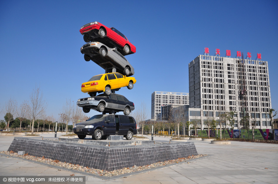 2015年12月17日,湖北省天门市,这座”汽车雕塑“是由当地一家汽车城建造的,雕塑中心的柱子作为主要支撑,用了五辆报废汽车耗时一个月搭建完成,目的是为了吸引眼球并使之成为车城的一个标志形象。