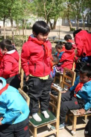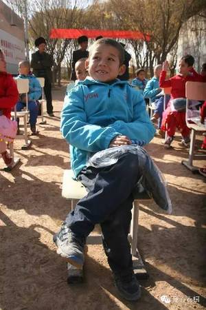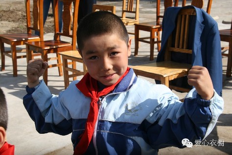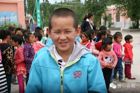 你看,孩子穿上新衣服那份得意,那份调皮,那爱心在他的脸上绽开了幸福的花朵。